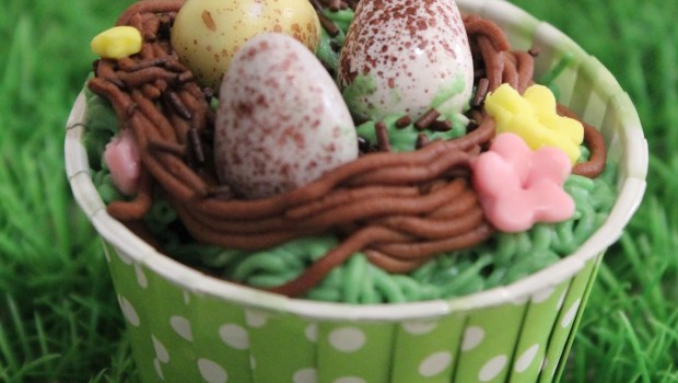 Y para la decoración final, con el machaca ajos y fondant marrón hice los nidos. Mis hijas hicieron flores de fondant y, por último, colocaron los huevos de chocolate que compramos en una tienda de chuches.