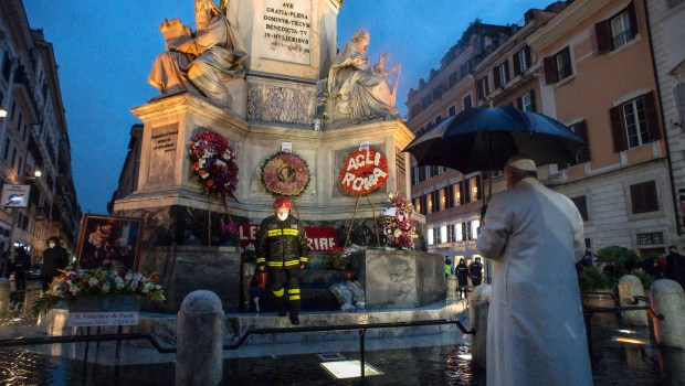 “Al amanecer, bajo la lluvia, depositó un ramo de rosas blancas en la base de la columna donde se encuentra la estatua de la Virgen María y se dirigió a Ella en oración, para que velara con amor a Roma y a sus habitantes, confiándole a Ella todos los que en esta ciudad y en el mundo están afligidos por la enfermedad y el desánimo”, añadió Matteo Bruni.