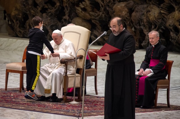 Mons. Leonardo Sapienza dejó su asiento a la derecha del Papa, ante el aplauso de los centenares de fieles reunidos en el Aula Pablo VI, para que el niño pudiera sentarse.