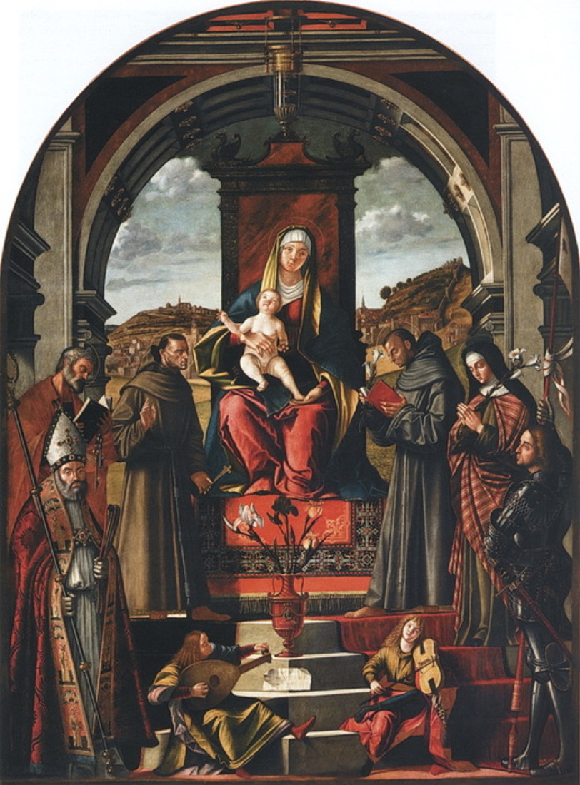 Fue durante los años de apogeo del artista veneciano, en 1518, que hizo un retablo para decorar el altar mayor de la iglesia de san Francisco en la ciudad veneciana de Pirano , titulado "Virgen en el trono con el Niño y los santos". El panel, que representa a la Virgen con el Niño Jesús, san Ambrosio, san Pedro, san Antonio, santa Clara, san Jorge y dos ángeles, se conservó dentro de la iglesia principal de Pirano durante casi 400 años, hasta que, en 1943, la Dirección General de Antigüedades y Bellas Artes de Italia intervino para protegerlo de los daños cuando la Segunda Guerra Mundial devastó Pirano y las ciudades cercanas.