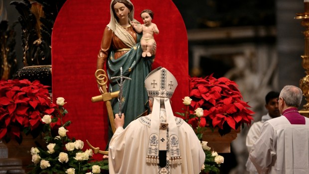 "En la maternidad divina de María vemos el encuentro de dos inmensas realidades ‘desarmadas’: la de Dios que renuncia a todos los privilegios de su divinidad para nacer según la carne, y la de la persona que, con confianza, abraza totalmente su voluntad", explicó el Obispo de Roma.